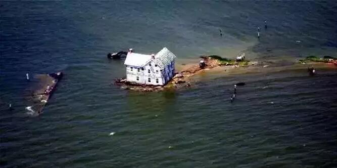 在美國(guó)東海岸,切薩皮克灣中有個(gè)荷蘭島(Holland),2010年的時(shí)候這個(gè)島嶼沉沒(méi)在大海的深處,但是曾經(jīng)在這個(gè)島上有一個(gè)小鎮(zhèn)。從1915年到2005年在這90年的期間,荷蘭島從原先的160畝到80畝的大小。2012年,荷蘭島完全被海水消蝕。