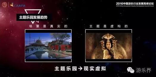 VR俗稱虛擬現(xiàn)實(今天我只講VR,AR不講,MR不講)。VR最早的發(fā)展應(yīng)該是運用在軍事科技上的。實際上樂園很多游樂設(shè)備都是從國防工業(yè)發(fā)展過來的,包括我們看到的動感電影,VR也是這樣的。當VR技術(shù)發(fā)展起來后,大家發(fā)現(xiàn)這個東西挺好的,拿來用也不錯,所以慢慢地,從個人的游戲發(fā)展成為大眾的游戲,從一個人玩變成很多人玩。為什么很多人玩呢?因為很多人玩,市場才能做大。另外我們再回頭看一下主題樂園的發(fā)展模式,從游樂園到主題樂園,到IP的主題樂園。其實主題樂園跟IP主題樂園差別不是很大。但是我們看到一個趨勢,就是真實的主題樂園發(fā)展到虛擬的主題樂園。而且真實跟虛擬之間有個界限,真實的越來越虛擬,虛擬的越來越真實。在這里面我們看到一個共識:主題樂園越來越講究個人化的發(fā)展。