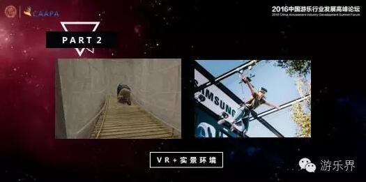 第三種是VR加上實景的環(huán)境,就是風(fēng)火雷電等,讓人有環(huán)境上的體驗,這個是一般家庭環(huán)境很難達到的,但是這個在室內(nèi)室外主題樂園都可以達到。
