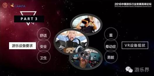 有三大要求,第一個要舒適、安全、衛(wèi)生。當然娛樂設(shè)施不止這些要求,我是挑最主要的講。我們看一看,你做游樂設(shè)備加上VR之后,在舒適上面就達不到標準,這個頭盔挺重的,各位試用過VR的人都知道,那個頭盔戴上去,十分鐘后你就不舒服了。有的人說沒有,還沒有到十分鐘。當然有奇葩,戴了一個小時,影片還沒有結(jié)束,舍不得放。