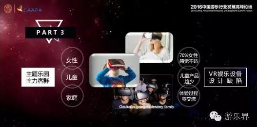 主題樂園60%幾是女性觀眾。但是女性對于VR的感受是什么呢?我們從報告當中看到了。70%的女性都覺得VR的體感感覺到不舒服。而且根據(jù)醫(yī)學(xué)的研究,女性同胞的生理構(gòu)造,對于眩暈特別敏感。也就是男同志的感受跟女同志感受不一樣。你覺得不暈,她暈。跟喝酒一樣,你不醉她醉。第二種是兒童,現(xiàn)在我們的產(chǎn)品,VR的內(nèi)容,針對兒童或者是瞄準兒童、適合兒童的內(nèi)容,其實不是太多。第三個是家庭,我們都知道做家庭,兩大一小,到現(xiàn)在開放二胎了,兩大兩小,四個人頭盔都戴上,是沒有交流的。所以對于這個主力客群也不是很有利。