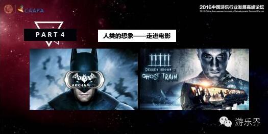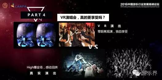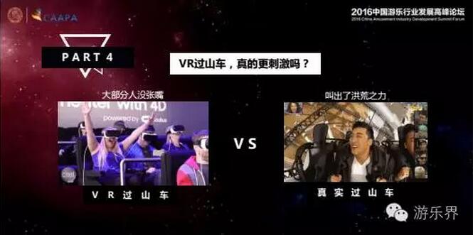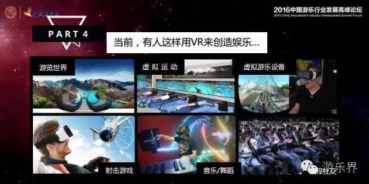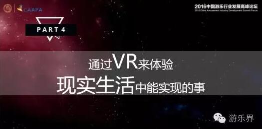 我們從四個角度來看,首先,可以用VR加游樂設(shè)備,但是我這里要強調(diào)一件事情,我個人不贊成VR+過山車,因為戴頭盔的時間,比玩過山車的時間還要長。一個過山車90秒就結(jié)束了,戴VR頭盔要戴上脫下,過山車動輒投資一億,結(jié)果戴VR頭盔,讓你的客流量會下降一半。