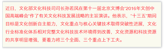 “十三五”期間我們的目標(biāo)是文化創(chuàng)新自主能力,文化重點與核心關(guān)鍵技術(shù)取得突破性進展,文化行業(yè)標(biāo)準(zhǔn)化體系相對完整文化科技技術(shù)環(huán)境得到改善,文化資源和科技資源的共享明顯增強,基本形成以市場為導(dǎo)向,以需求為牽引,以運用為驅(qū)動,以文化科技企業(yè)為主體,協(xié)同創(chuàng)新、研發(fā)公關(guān)、成果轉(zhuǎn)化、區(qū)域同、人才培養(yǎng)構(gòu)成的文化創(chuàng)新體系。我們著力將三個全面、三個重點上下工夫。