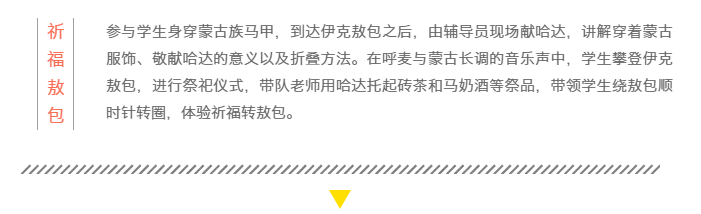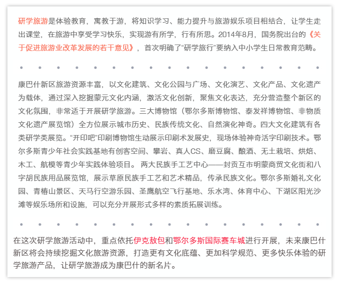 2016年10月19日-10月25日,康巴什旅游局聯(lián)合教體局、鄂爾多斯人文科技研究院、康巴什實(shí)驗(yàn)小學(xué)組織的“探秘蒙元文化,感悟天驕智慧”研學(xué)旅游實(shí)踐活動(dòng)正式舉辦。1400余名學(xué)生按班級(jí)分隊(duì),在伊克敖包和鄂爾多斯國際賽車城分別開展活動(dòng),本次研學(xué)旅游活動(dòng)包含了“祈福敖包、牧人大闖關(guān)、馬背上的小火車、天驕?zhǔn)サ貙毑?、蒙古鐵騎軍、草原發(fā)明家”等六項(xiàng)活動(dòng)。在競(jìng)賽與歡笑中,參與學(xué)生不僅了解了蒙古族服飾、敖包祈福、蒙古歷史等蒙元文化,感悟成吉思汗圣地智慧,增強(qiáng)了地方榮譽(yù)感和自豪感,同時(shí)也塑造了團(tuán)隊(duì)活力,培養(yǎng)學(xué)生的團(tuán)隊(duì)合作意識(shí)。