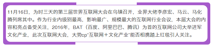 互聯(lián)網(wǎng)消費(fèi)市場已趨于穩(wěn)定與飽和,而對文化資源有充分把控能力的企業(yè)卻有很大探索空間,文化產(chǎn)業(yè)大佬進(jìn)軍互聯(lián)網(wǎng)行業(yè)同時(shí),互聯(lián)網(wǎng)巨頭也在涉足文化產(chǎn)業(yè),提高自己的業(yè)務(wù)范圍和知名度。2016年以來,阿里影業(yè)、百度影業(yè)、騰訊文學(xué)相繼成立。