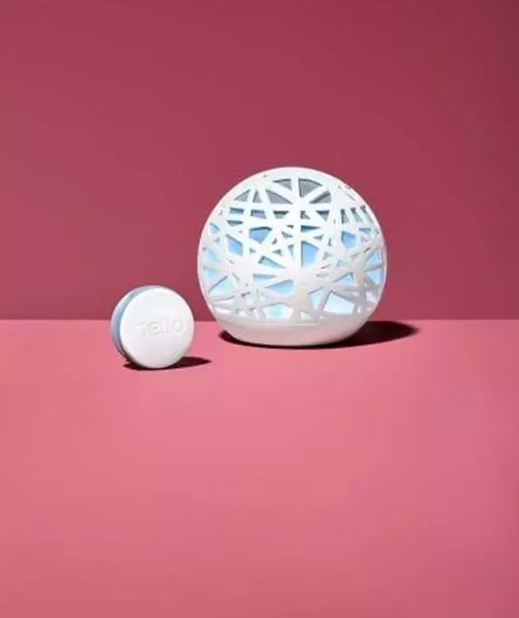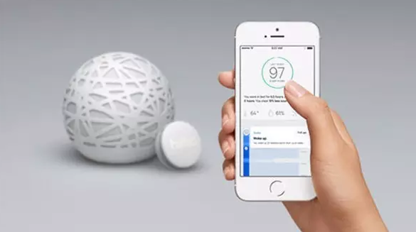 Sense包括兩個(gè)部分,大的放光球體,可以擺放在床頭,小的傳感器可以?shī)A在枕頭上,它會(huì)把用戶的移動(dòng)信息發(fā)送給主體球。