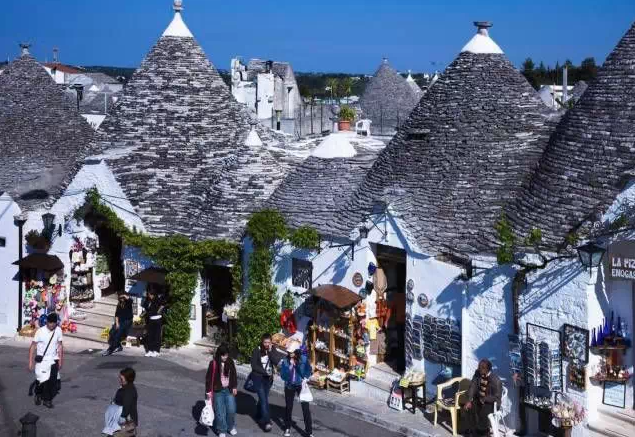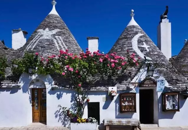 意大利的阿爾貝羅貝洛被人稱為“天堂小鎮(zhèn)”,這里保存著1000多座造型奇特的圓錐石頂屋(Trulli),1996年,這里也被評為了世界文化遺產(chǎn)。許多圓錐屋頂都帶有十字架或某種怪異的圖案標(biāo)識。阿爾貝羅貝洛的意思是“美麗的橡樹”,走在小鎮(zhèn)的街道上,滿眼所見都是白色的圓錐石頂屋,在藍(lán)天的映襯下,就像是一個童話般的世界。