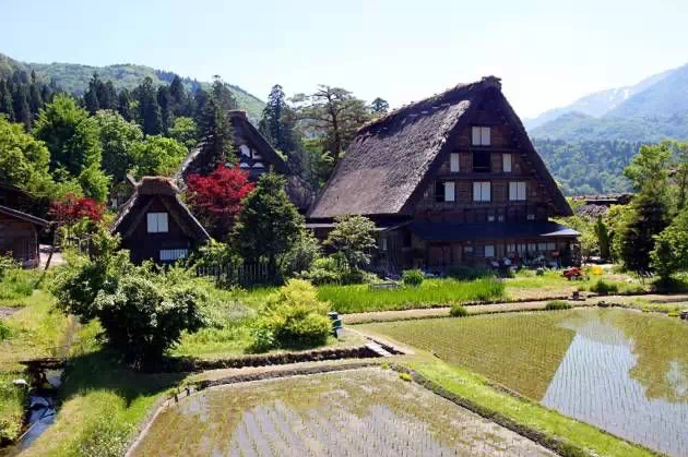 位于日本白川鄉(xiāng)的荻町,擁有114棟合掌屋。溪水蜿蜒流過的約1公里長的河濱谷地上,大小不一、高矮不等的合掌屋錯落有致地排列開來,情景蔚為壯觀。合掌屋的屋頂外型猶如兩只手掌合攏作揖,已有三四百年的歷史。木屋屋頂設(shè)計成60度銳角的正三角形,可使屋頂最大限度地承載厚重的積雪,同時讓過高的積雪自然滑落。利用就地取材的干草堆疊覆蓋屋頂以及把合掌屋建成南北朝向,也是考慮到使木屋與山脈成垂直走向,借此阻擋順著地勢刮下來的寒風(fēng),并調(diào)節(jié)日照量,使木屋冬暖夏涼。