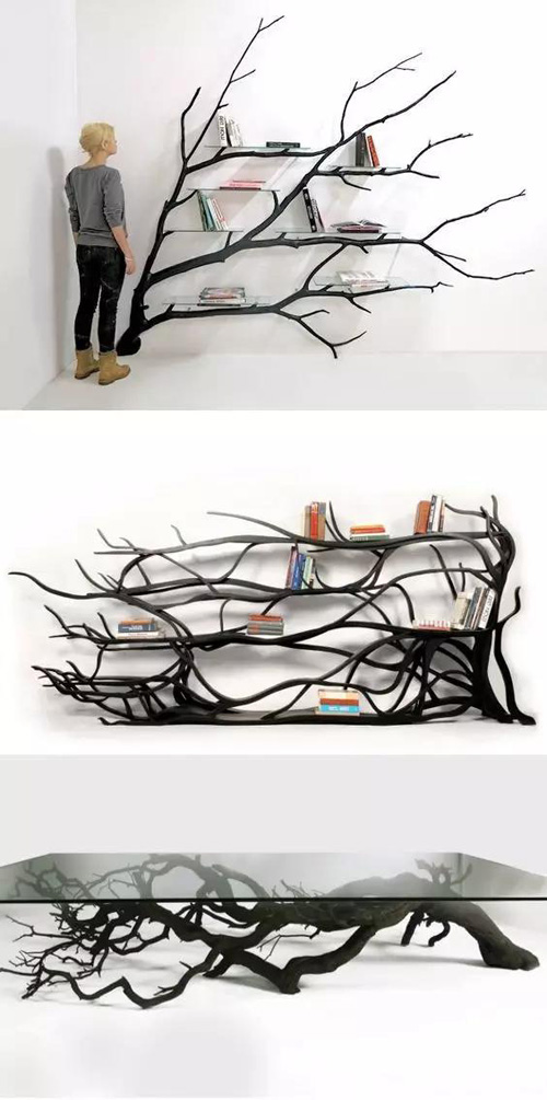 木質(zhì)書(shū)架,樹(shù)枝與玻璃組合起來(lái),可以充當(dāng)書(shū)架,也可以充當(dāng)茶幾,絕對(duì)個(gè)性化,拒絕平凡。