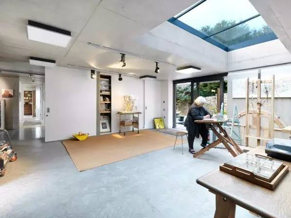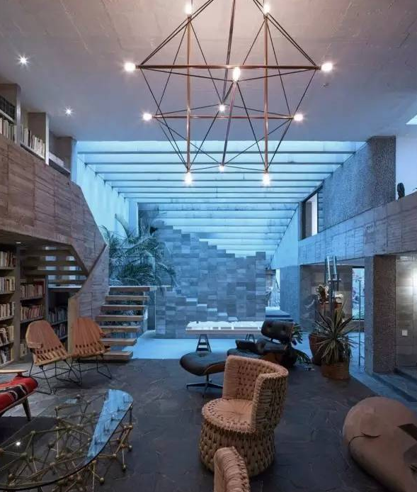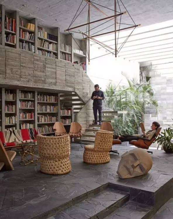 這是一對(duì)藝術(shù)家夫婦自己設(shè)計(jì)的一座混凝土住宅,這里既是他們的家也是他們的工作室,充滿了現(xiàn)代主義建筑的粗野主義風(fēng)格。忍不住感嘆一句,兩層高的書架真的好棒。