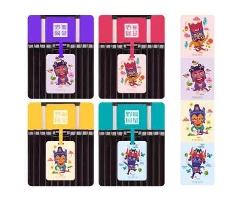 來自設(shè)計師畢筱汐的這件作品,采用了貴州精粹儺戲為主題的行李牌,用偏艷麗的色彩和滑稽的表情動作相結(jié)合,讓人愛不釋手,馬上就相帶回家。