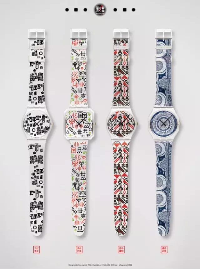 而這幾款文創(chuàng)手表是來自朱垣銀老師,靈感來自屯堡民居中的窗戶、水篦子、木雕造型,應(yīng)用在手表的造型上。運用安順地區(qū)獨特的紅崖天書、苗繡,以及貴州地區(qū)蠟染、水書文字。呈現(xiàn)在透明的手表上,提煉出時間長河中貴州文化的精粹。