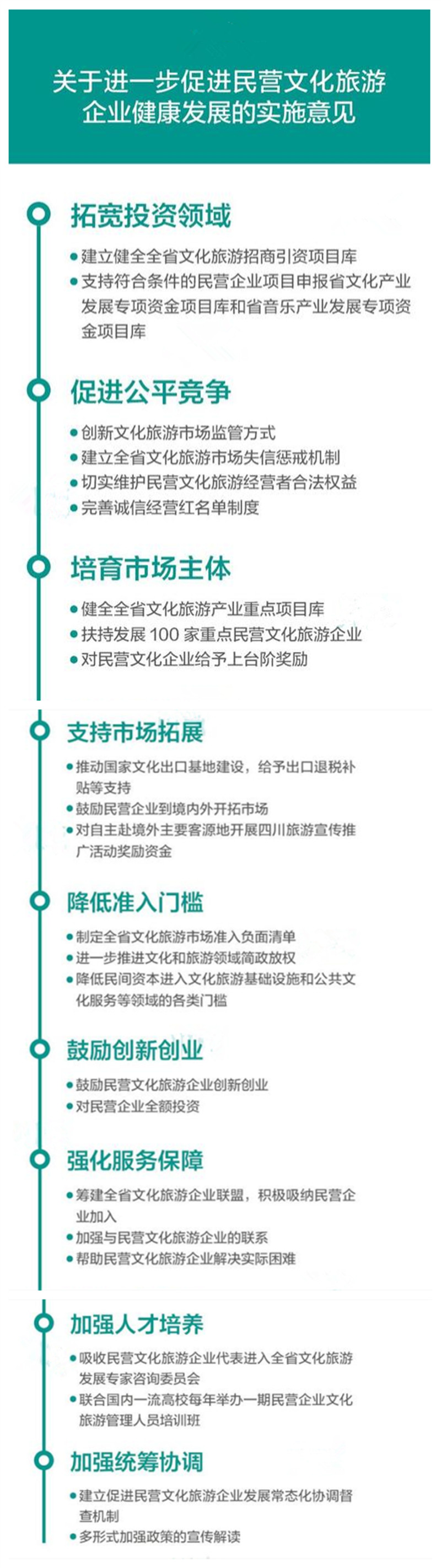 此外,四川省還將推出更多具體措施。比如,建立全省銀政企聯(lián)席工作會議制度,幫助解決民營文化和旅游企業(yè)解決融資難、融資貴等問題;吸收民營文化旅游企業(yè)代表進(jìn)入全省文化旅游發(fā)展專家咨詢委員會;聯(lián)合國內(nèi)一流高校加強(qiáng)民營企業(yè)文化旅游管理人員培訓(xùn)?!巴ㄟ^這些針對性、操作性強(qiáng)的舉措,將切實(shí)推動《實(shí)施意見》的落實(shí),努力為民營文化旅游企業(yè)健康發(fā)展?fàn)I造良好環(huán)境?!?