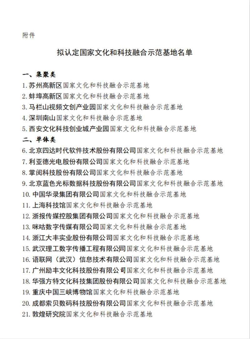 按照《國家文化和科技融合示范基地認(rèn)定管理辦法(試行)》(國科發(fā)高〔2018〕72號)、《科技部辦公廳、中宣部文改辦關(guān)于開展2018年國家文化和科技融合示范基地申報工作的通知》(國科辦高〔2018〕17號)要求,科技部、中宣部會同中央網(wǎng)信辦、文化和旅游部、廣電總局啟動了國家文化和科技融合示范基地認(rèn)定工作。經(jīng)合規(guī)性審核、專家函評、會議答辯、調(diào)研實(shí)勘、部門商議等環(huán)節(jié),確定了21家擬認(rèn)定基地名單?,F(xiàn)予以公示,公示期2019年3月15日-3月21日(5個工作日)。