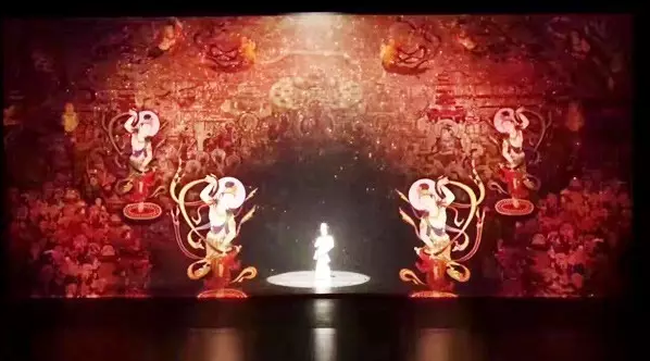 與7月初在香港紅磡體育館的演出相比,此次《絲路花雨》敦煌大劇院演出,舞臺(tái)舞美有很大變化。據(jù)數(shù)虎圖像設(shè)計(jì)師介紹,整個(gè)舞臺(tái)呈包裹式,意在呈現(xiàn)強(qiáng)烈的3D立體演出效果。